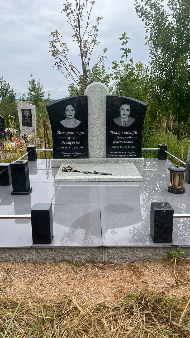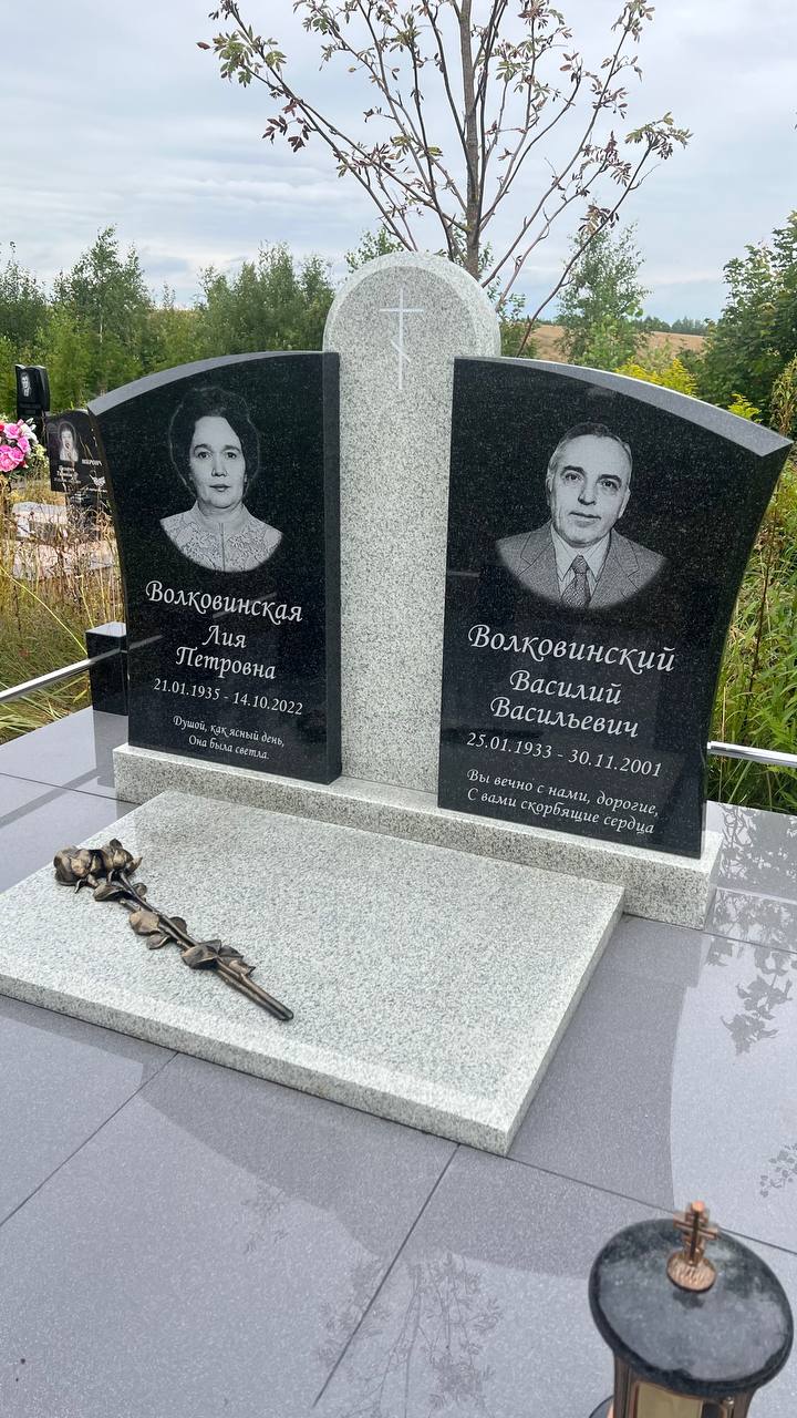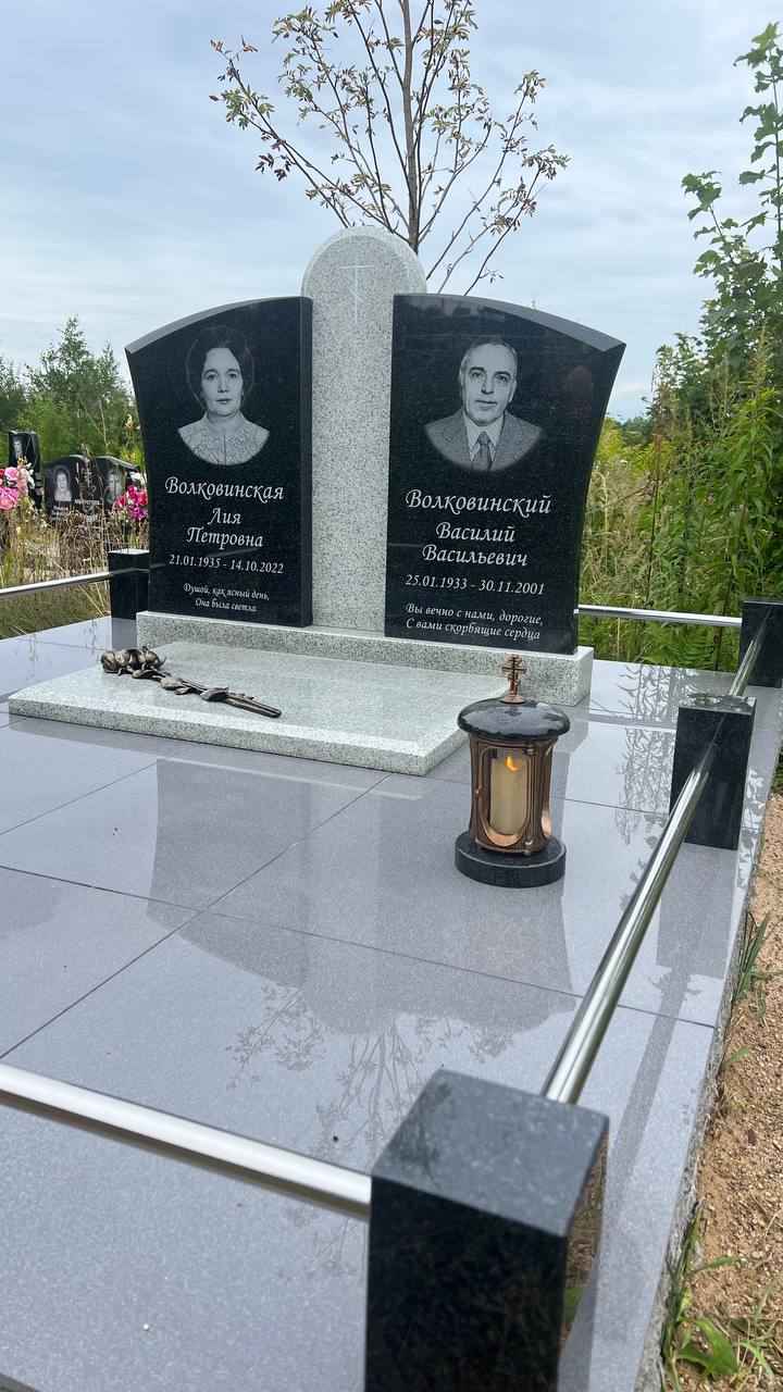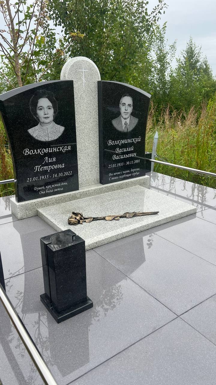 | Исполнение | Лазерная гравировка портретов и эпитафий, учтено будущее подзахоронение урны |