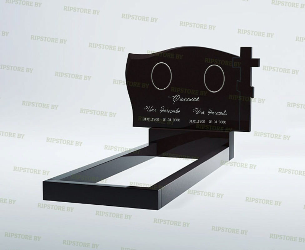 Двойной памятник B-40 впечатляет плавным, изящно изогнутым верхом, дополненным небольшим крестом с правой стороны. Такая волнообразная форма придаёт стеле мягкость и гармонию, сохраняя при этом торжественную строгость. Полированная поверхность чёрного гранита подчёркивает благородство материала, позволяя эффектно отразить любую гравировку или декоративные детали.