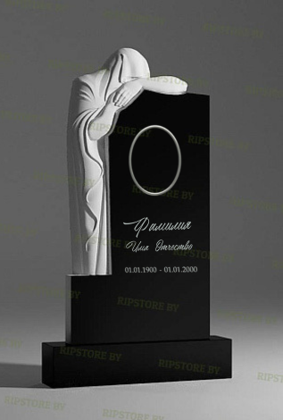 Детали скульптуры выполнены с особой точностью: плавные складки одежд, опущенная голова, жест рук создают образ, наполненный трогательной искренностью. Контраст между гладкой черной поверхностью стелы и светлой скульптурой делает памятник выразительным и элегантным. Пространство на стеле позволяет разместить индивидуальную гравировку или памятные надписи.