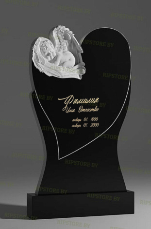 Скульптурный памятник СС-28 сразу привлекает внимание плавный контур в форме сердца, выполненный из глубокого черного камня. В верхней части композиции изящно расположена фигура ангела, который трепетно обнимает младенца. Контраст светлого и темного оттенков усиливает впечатление нежности и подчеркивает бережное отношение к памяти об ушедшем человеке.