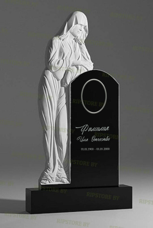 Скульптура выполнена с высокой детализацией: мягкие изгибы одеяния создают эффект движения, а закрытая голова подчеркивает духовный характер образа. Чёрная гладкая стела контрастирует с вырезанной фигурой, делая композицию выразительной и запоминающейся. Поверхность памятника оставляет место для индивидуальных надписей, позволяя запечатлеть значимые слова и символику.